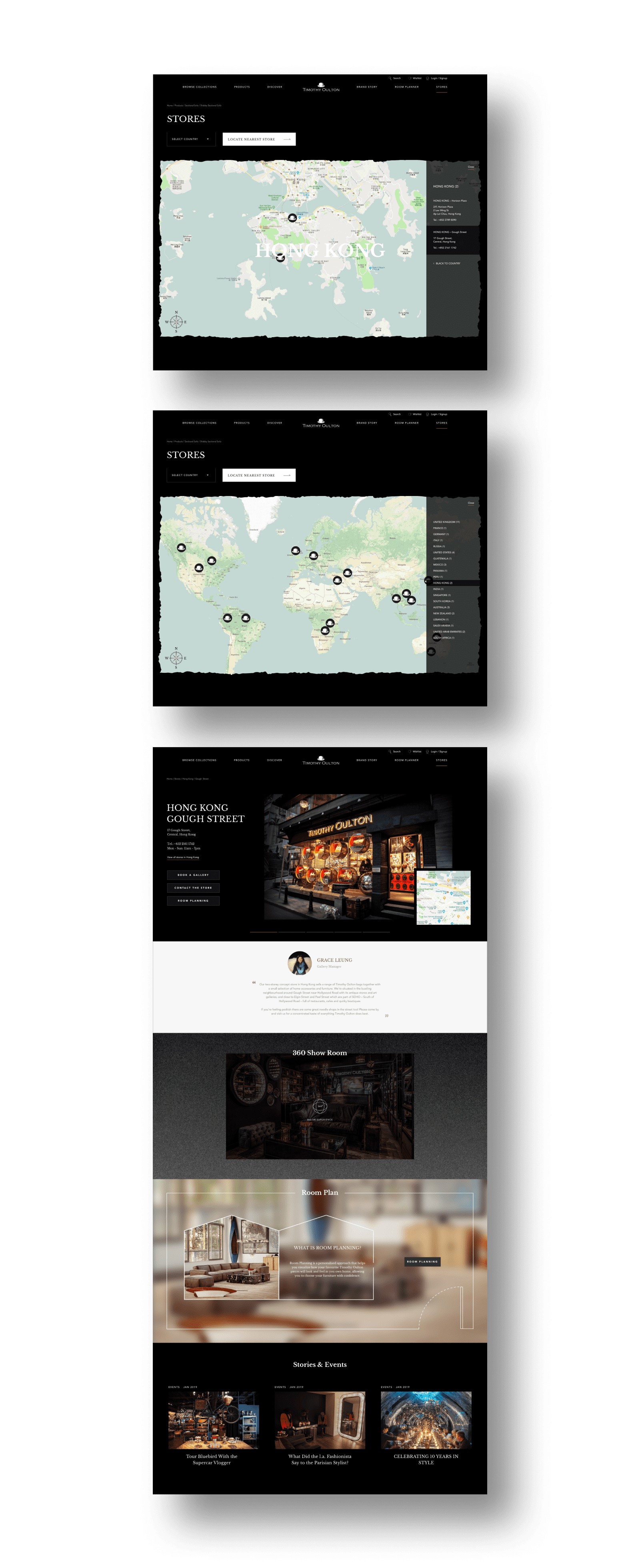 I used a vintage color tone for the google map and added a paper edge. I was trying to made it look like a nautical map, so people can use this map to discover more Timothy Oulton stores and found out that each store had different styles and features.