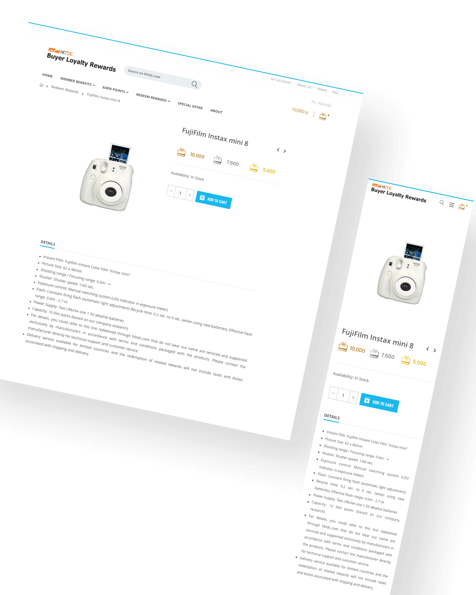 This website was built for the buyers redeeming rewards. When the buyers finished a trade on HKTDC Trade Fair or on hktdc.com, they can earn the reward points and redeem rewards with their points.